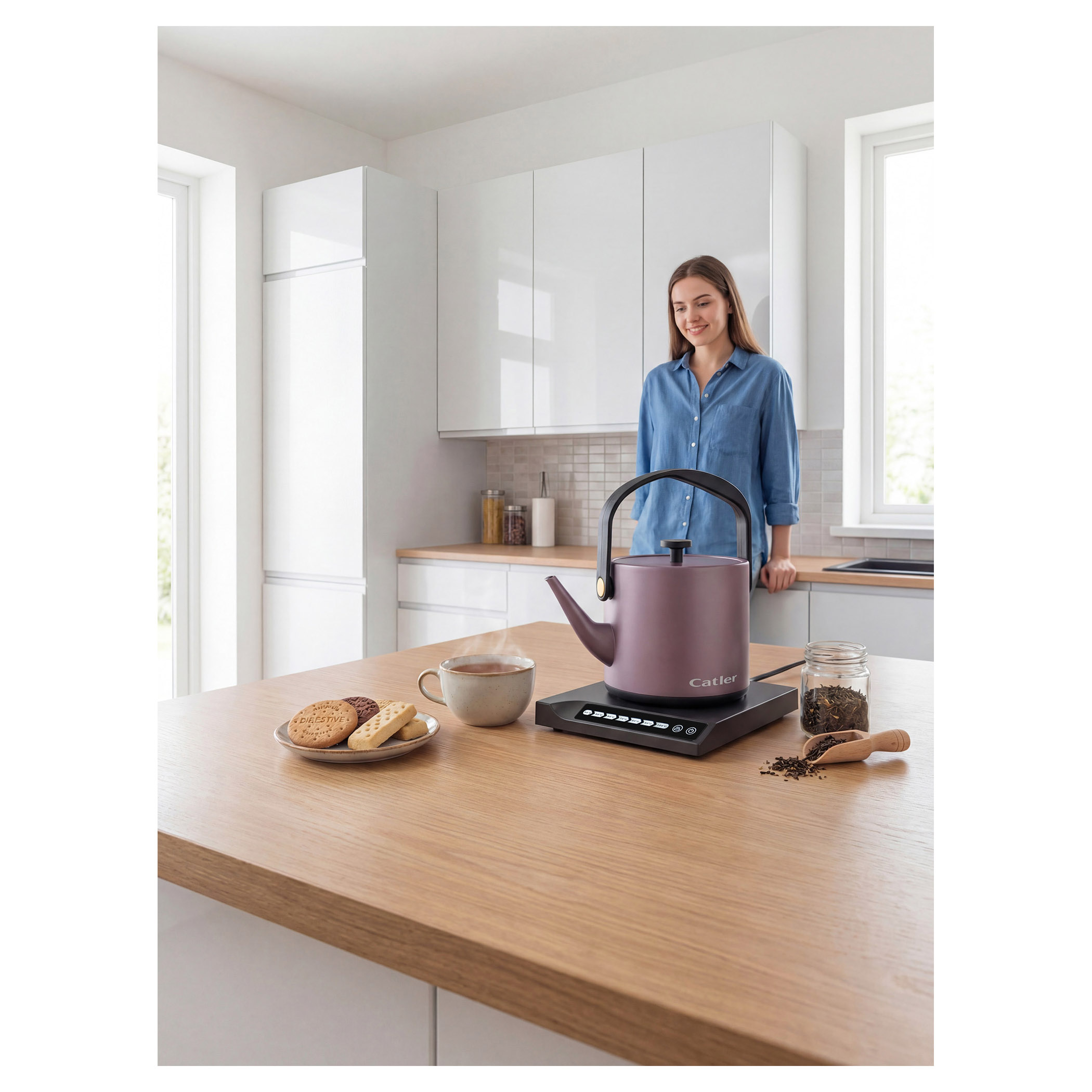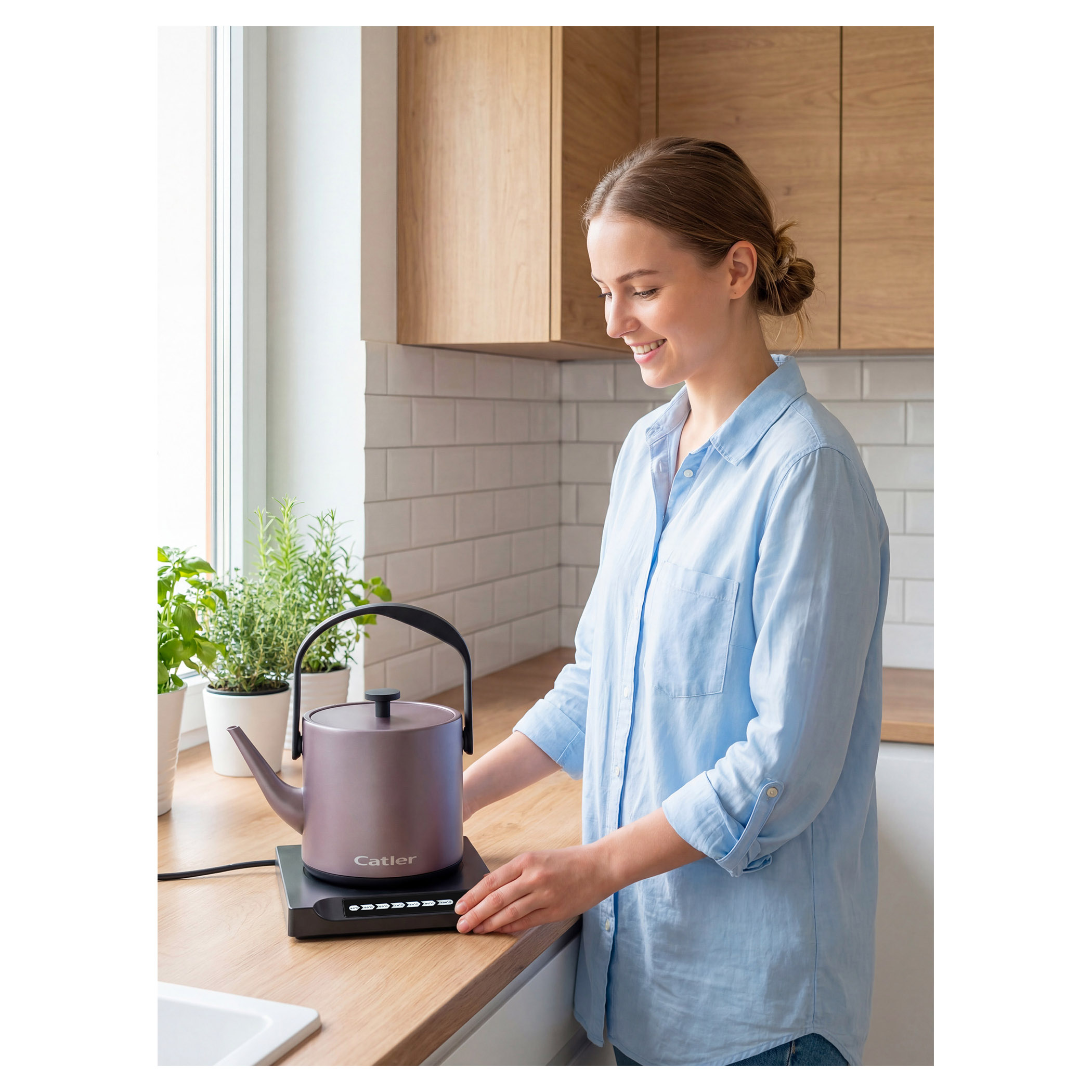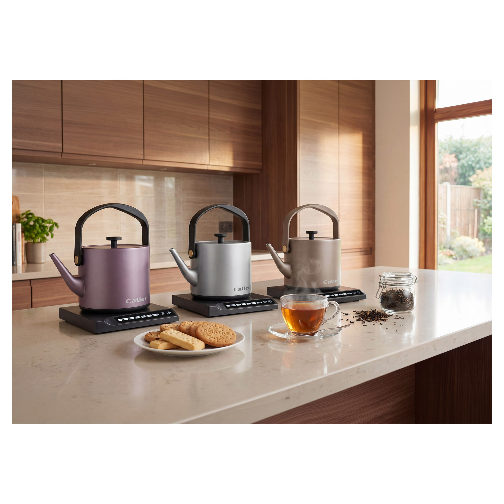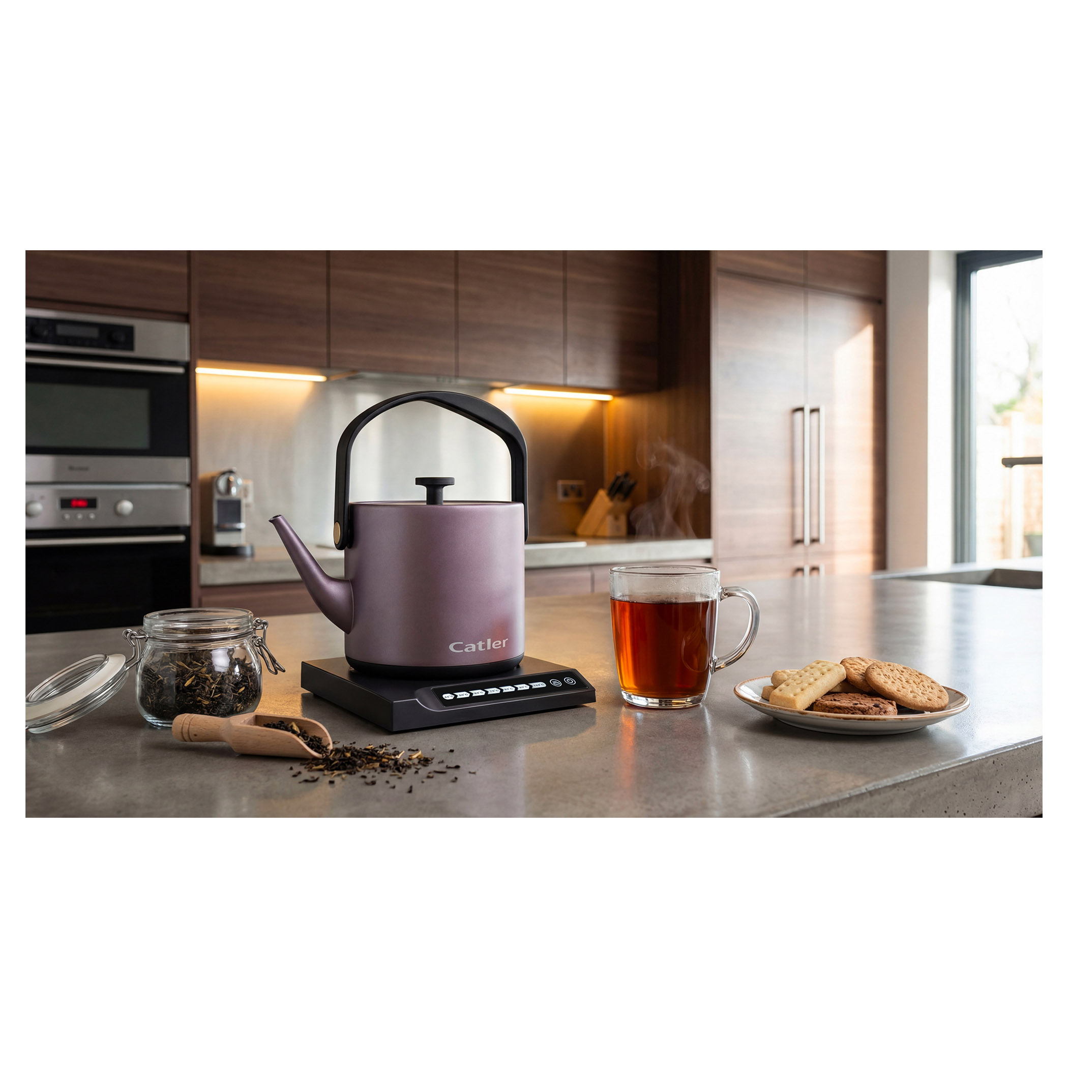Elektrická varná kanvica s reguláciou teploty a dotykovým ovládacím panelom.